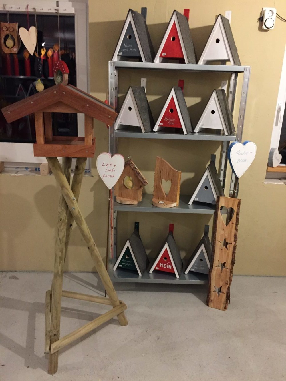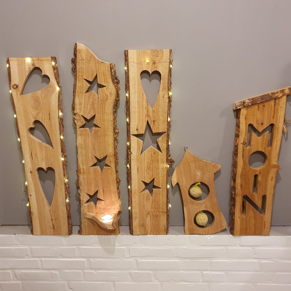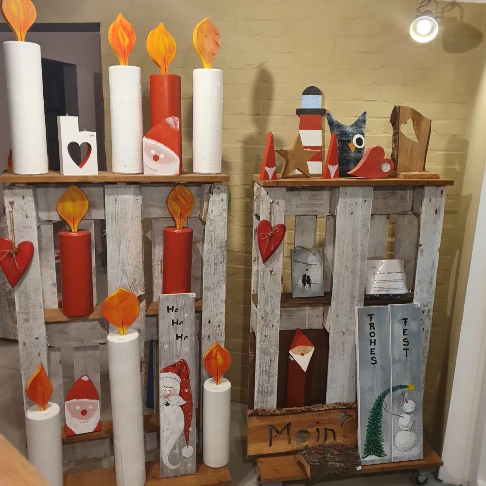 Hier entstehen nun schöne kreative Unikate aus Holz und kommen nach eventuellen weiteren Arbeitsschritten wie z.B. lackieren oder bemalen direkt in die neuen Verkaufsräume. Dort findet man alles aus meiner „Holzwerkstatt“ und Martjes „Schmuckstuv“.